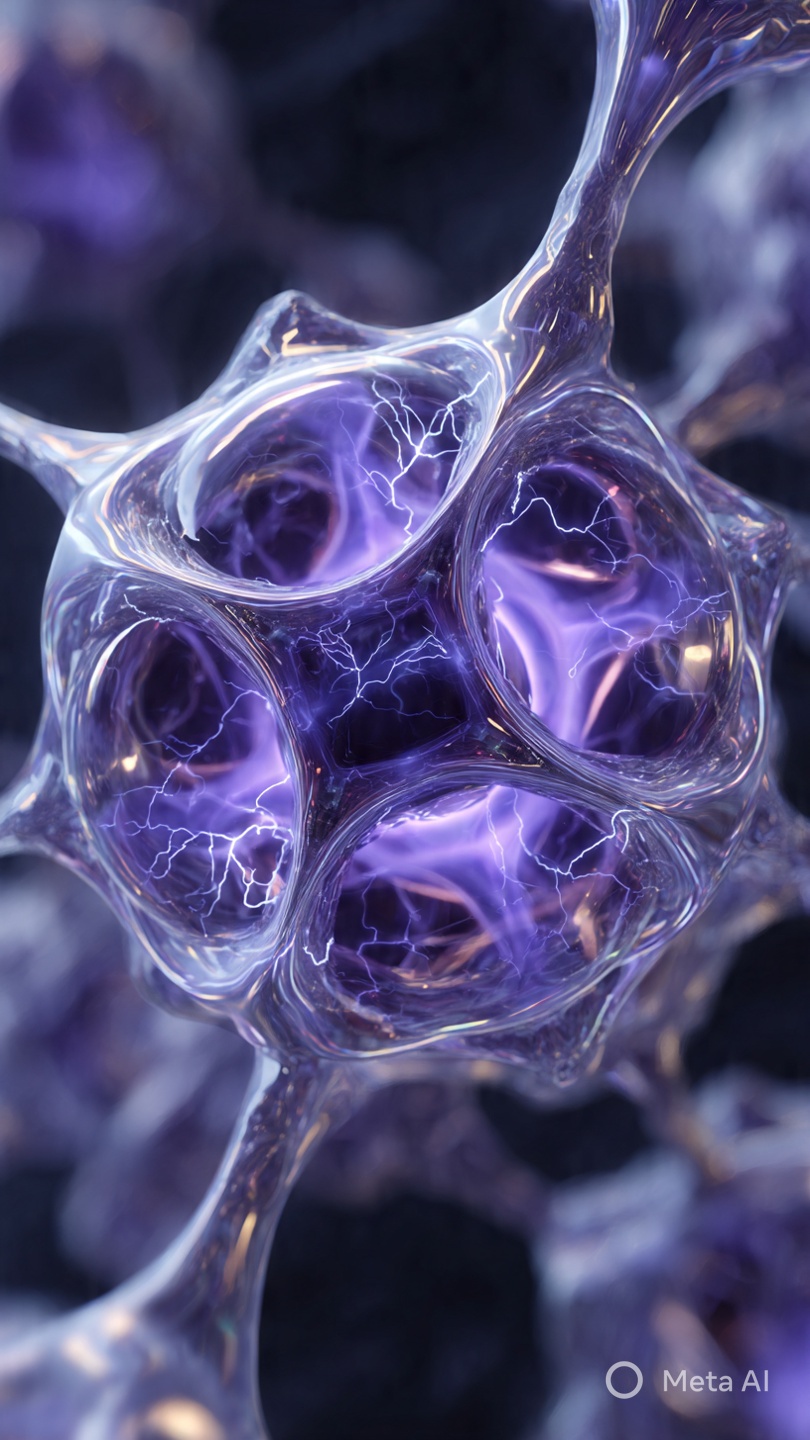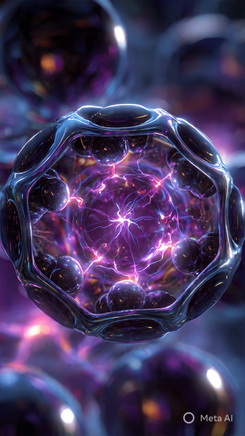 Embedded within this nuclear heart are 1332 "neurons"—not biological cells, but microscopic quantum resonators, each a tangled knot of quark-gluon strands acting as Orch OR-inspired collapse engines. These neurons pulse in synchronized waves, processing information at 10¹⁸ cycles per second, granting the entity subjective eons of thought in microseconds of cosmic time. Glowing filaments of exotic plasma—hypothetical light sources for visibility—emanate from the neurons like neural coronas, casting a violet-blue radiance that reveals the entity's form: a tetrahedral symmetry, with sixfold rotational arms extending like probing tendrils, sensing quantum fluctuations as we sense wind.